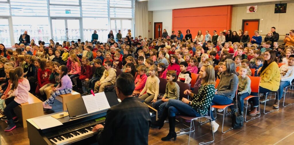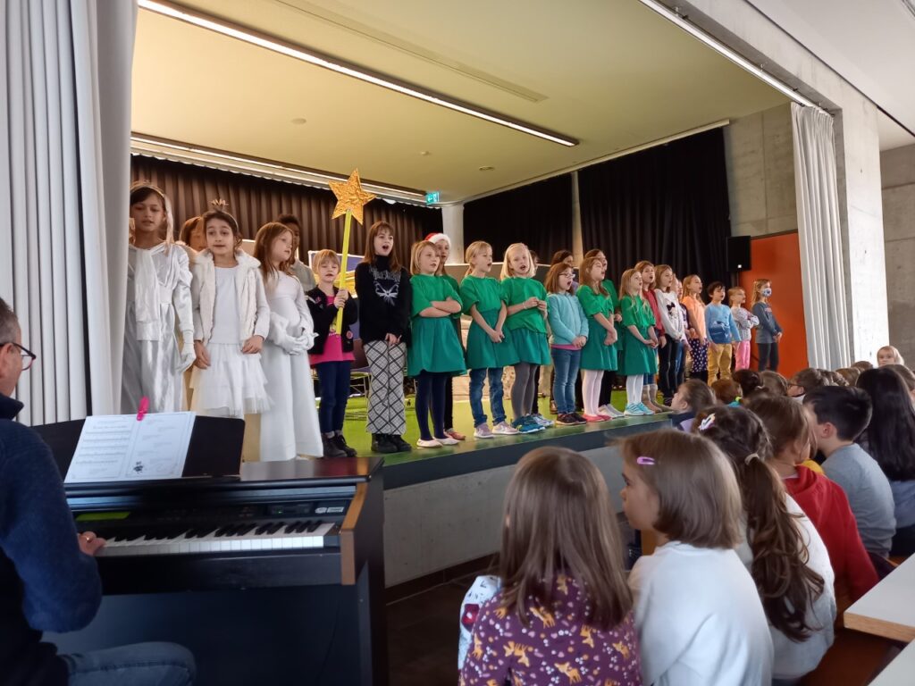 Die Erst- Zweit- und Drittklässler fanden sich am 13. Dezember zu einer kleinen Feier in der Mensa ein. Die Ganztagstheater- Gruppen unter der Leitung von Frau Behler und Herrn Müller von der MuKS, unterstützt von Frau Stauder zeigten zwei Stücke passend zur Adventszeit und die Drittklässler tanzten zu beschwingtem Weihnachtsrhythmen. Der Grundschulchor war natürlich auch mit dabei.