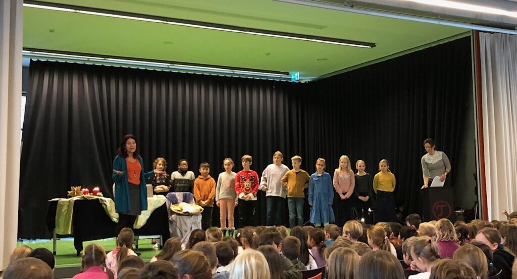 Am Dienstag, den 21. Dezember war es dann soweit, der letzte Schultag endete mit dem gemeinsamen, ökumenischen Wortgottesdienst in der Mensa. Nach dem Hören der Weihnachtsgeschichte war allen Kindern klar: An Weihnachten feiern wir den Geburtstag von Jesus. Gemeinsam mit Pastoralreferent Tobias Schnieders dachten die Kinder über die besondere Bedeutung von Geburtstageschenken nach und über das große Geschenk, dass uns Gott gemacht hat, als er uns seinen Sohn Jesus auf die Welt geschickt hat. Nach dem traditionellen „Feliz Navidad“ ging es dann auf in die wohlverdienten Ferien.