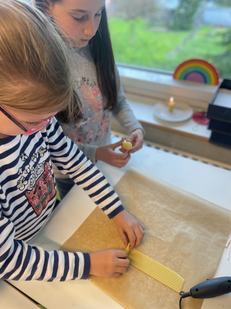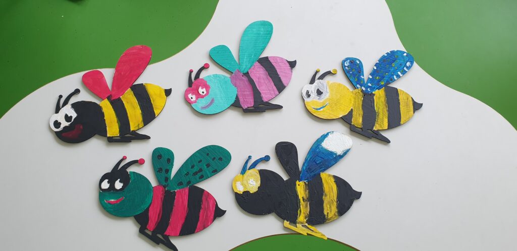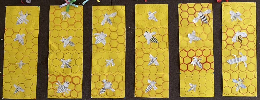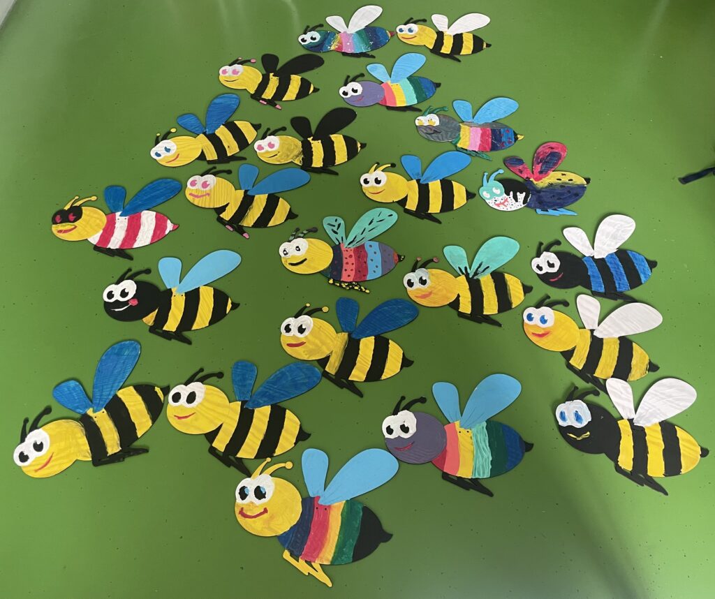 Im Rahmen des Kinderkunstprojektes der Stadt Bruchsal beschäftigten sich die Joß- Fritz- Kinder eine Woche lang mit Insekten und natürlich besonders mit der Biene. Ziel der Aktion war es nämlich nicht nur, mit den bunten Holzbienen im Frühjahr und Sommer das Stadtbild zu verschönern, sondern auch das Bewusstsein für den Schutz unserer Artenvielfalt zu entwickeln. In den einzelnen Klassenstufen fanden viele unterschiedliche Aktionen statt: In einer Bienenwerkstatt wurde Wissen über eines die bedeutenden Insekten unseres Ökosystems gesammelt, die Ausrüstung eines Imkers wurde bestaunt, Honigbrote verkostet, Bienenwachskerzen gedreht und Fensterbilder gestaltet, summende Bienen aus Holzklammern gebastelt und im Reliunterricht gab es den Bienensegen. Den Hummelflug von Rimski- Korsakow lernten viele Kinder im Musikunterricht kennen.