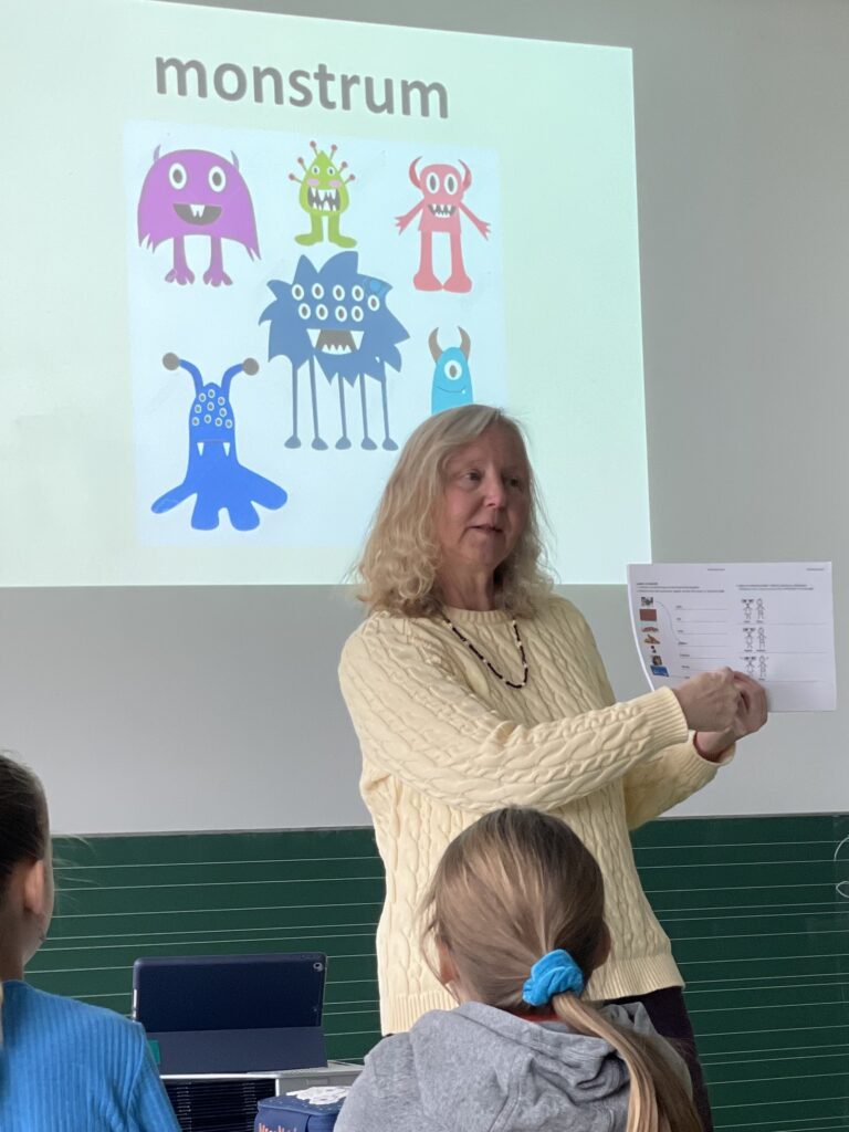 Am Montag, den 5. 02. 2024 durften interessierte Viertklässler und Viertklässlerinnen an einer Schnupperstunde Latein teilnehmen. Frau Fides Frühwirth vom Schönborngymnasium erzählte interessant und informativ, was die Kinder im Lateinunterricht am Gymnasium erwartet. Eingebunden in einer anschaulichen Geschichte konnten sich die Kinder erste Wörter erarbeiten und übersetzen. „Latein ist nicht tot, es lebt in vielen Sprachen weiter“, so Frühwirth und die Kinder konnten schnell feststellen, dass es viele Parallelen zu ganz alltäglichen Begriffen aus verschiedenen Sprachen zu entdecken gibt.
