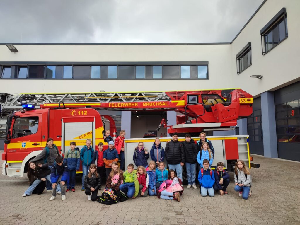 Wir waren am Donnerstag, den 18.04.2024, bei der Feuerwehr Bruchsal. Dort durften wir an spannenden Experimenten teilnehmen. Wir hatten ganz schön viel Glück, dass mitten in den Versuchen ein Einsatz war. Dabei haben wir total vergessen, die Kerzen, die wir angezündet hatten, auszumachen. Doch die nette Feuerwehrfrau (Anna-Lena) hatte daran gedacht. Danach mussten wir uns stärken und ein Feuerwehrmann hat uns die bis zu 7m tiefen Rohrstangen, an denen die Feuerwehrleute bei einem Einsatz schnell runterrutschen können, gezeigt. Das war ganz schön beeindruckend. Kurz darauf wurden wir in Gruppen eingeteilt und durften uns die verschiedenen Fahrzeuge und Räume der Feuerwehr angucken. Zum Schluss durften wir vor dem Drehleiterfahrzeug ein Foto machen.
