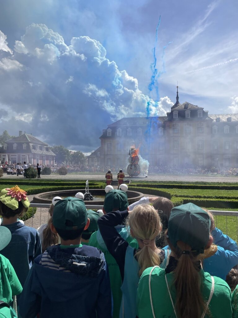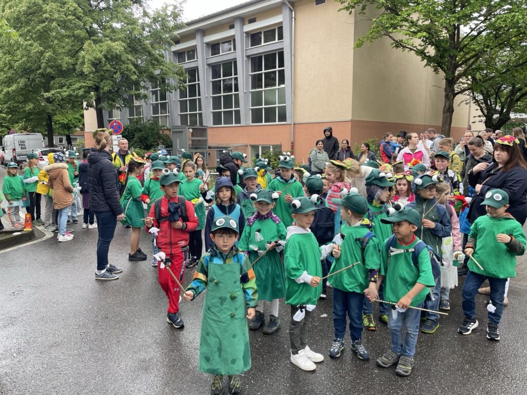 Pünktlich zum Beginn des Umzuges kam nach dem eher nassen Tagesbeginn die Sonne hinter den Wolken hervor und strahlte mit den Kindern um die Wette. Rund 50 kleine Frösche und Seerosen aus der Joß- Fritz-Schule beteiligten sich an dem traditionsreichen Umzug und bestaunten den großen Schneemann, der im Schlosshof sein Ende fand und damit die Sommerzeit einläutete.