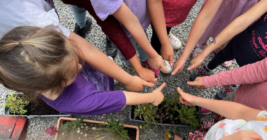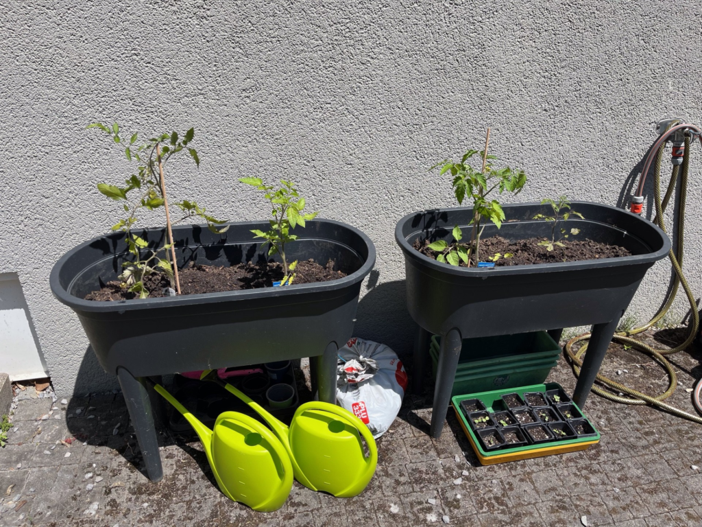 Nachdem das Wetter nach den Pfingstferien doch etwas besser wurde, konnten die Ganztageskinder der ersten Klassen zusammen mit Frau Dietz und Frau Weißhaar an das weitere Begrünen unseres Innenhof gehen. Neben der Palettenwand mit den Sukkulenten und der Kräuterschnecke zogen weitere Pflanzen ein: Die Gärtnerei Lauber spendierte uns Tomatenpflanzen, die nun in Hochbeeten ein neues Zuhause gefunden haben. Wir freuen uns schon auf die erste Ernte. Genießen werden wir auch die erste Gurke, die schon richtig groß geworden ist. Vom Penny in Büchenau erhielten wir noch ein paar blühende Pflanzen, die wir nun gut pflegen müssen, da sie ein bisschen vertrocknet waren. Jedes Kind hat noch ein kleines Töpfchen mit Sonnenblumensamen bestückt und die ersten Pflänzchen haben sich schon entwickelt. (SD)