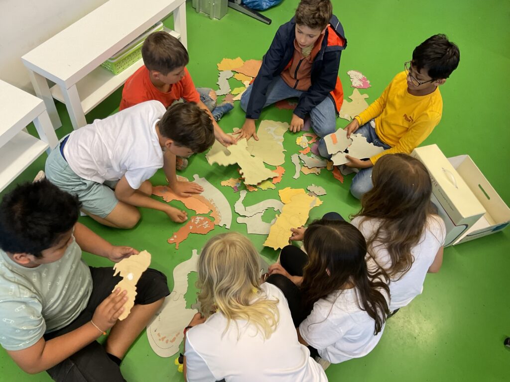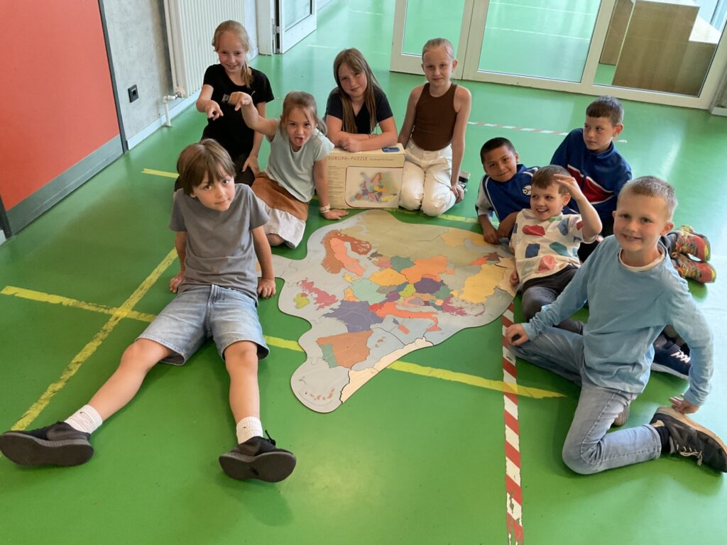 Gleich nach den Pfingstferien versammelten sich alle Klassen der Grundschule in der Mensa, um gemeinsam in die Europa- Woche zu starten. Schulleiterin Alexandra Nohl gab mit der blauen Flagge mit den gelben Sternen einen ersten Impuls, um was es geht- Einheit, Solidarität und Harmonie. „Die Ode an die Freude“ und mit den „kleinen Europäern“ von R. Zuckowski stimmten sich die Kinder auf die Woche ein, bevor in den Klassenzimmern die Europakarte studiert wurde, Ländersteckbriefe erstellt und viele andere Aktionen rund um Europa und der Europäischen Union zum Thema wurden. Neugierig erkundeten die Kinder andere Kulturen und stellten schnell fest, dass viele Kinder unserer Schulgemeinschaft ganz unterschiedliche Wurzeln in Europa und der Welt haben. Wie wichtig die europäische Gemeinschaft für ein friedliches Zusammenleben ist und warum die Europawahlen gerade für die kommenden Generationen von großer Bedeutung sind, erarbeiteten vor allem die Dritt- und Viertklässler. „Europoly“- das Angebot der Landeszentrale für politische Bildung, durften dann zwei dritte Klassen nutzen und puzzelten begeistert an großen Europakarten, hörten sich verschiedene Sprachen an und spielten „Europa- 1, 2 oder 3“.