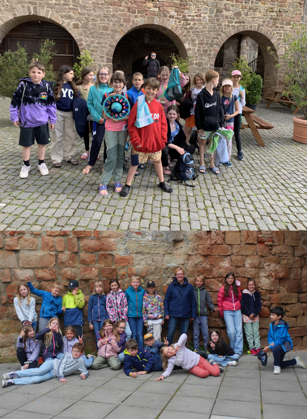 Aufgeregt und sehr gespannt trafen sich am Mittwoch, den 12. Juni, die Klassen 4a und 4b im Schulhof, um gemeinsam auf Klassenfahrt in die Burgjugendherberge Altleiningen zu fahren. Es warteten fast drei Tage voller neuer Erfahrungen und Herausforderungen auf uns. Schon die Hinfahrt mit dem Bus war sehr spannend, denn es kamen uns auf einer sehr schmalen Straße zwei andere Busse entgegen. Unser Busfahrer war super und manövrierte uns durch die Engstelle. Als wir ankamen, durften wir unsere Zimmer beziehen und uns gemütlich einrichten. Später baute jede Klasse mit über 8000 Bausteinen ihre eigene Klassenstadt. Am folgenden Tag ging es in den Wald. Dort bauten wir mit allem, was wir finden konnten, Tipis und stellten uns verschiedenen Aufgaben. Außerdem erkletterten wir eine große alte Linde, den „Monkeybaum“. Wir spielten viele Kooperationsspiele und tobten uns im Schwimmbad aus. Am Abend machten wir am Lagerfeuer Stockbrot (und natürlich Marshmallows) und gingen auf eine Nachtwanderung. In den alten Burgmauern hatten wir viel Spaß und kamen am Freitag etwas müde aber glücklich wieder in Untergrombach an.
