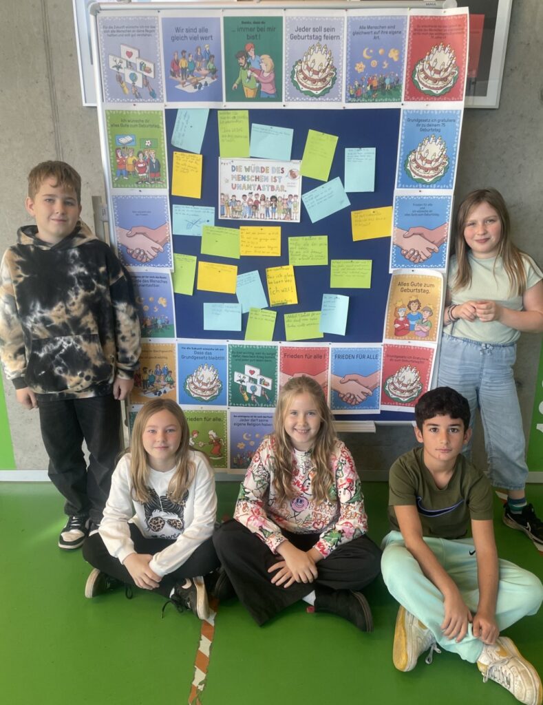 Es wurde zusammen überlegt, diskutiert und sich auf kreative Weise mit dem Thema auseinandergesetzt. Besonders der erste und wichtigste Artikel des Grundgesetzes, die unantastbare Würde des Menschen, die unabhängig ist von Herkunft, Geschlecht, Religion oder sozialem Status, war für die Kinder sehr einprägsam. „Es ist wie ein Schutzschild“, beschrieb Markus aus der vierten Klasse die Bedeutung. Als Fundament für alle weiteren Grundrechte ist der Artikel 1 unverzichtbar für unsere Gesellschaftsordnung.