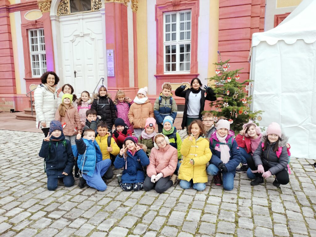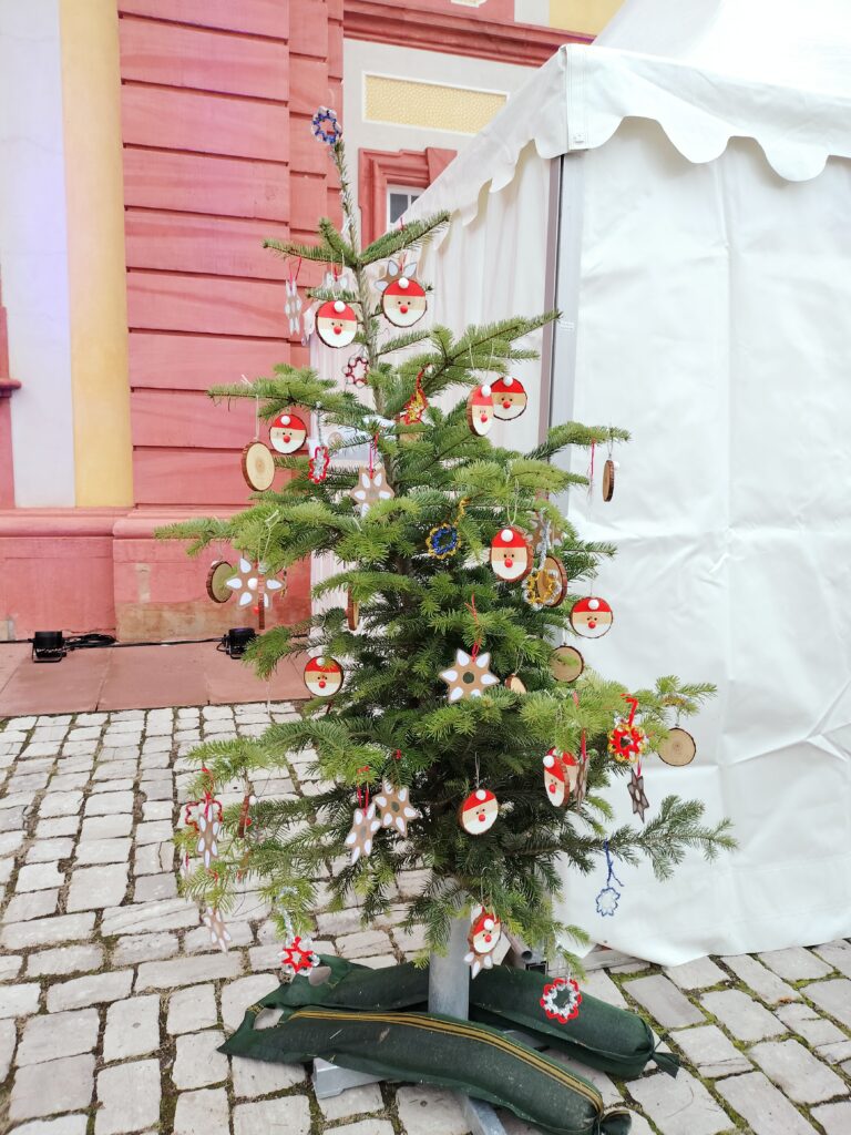 Mit vielen selbstgebastelten Kunstwerken machten sich die Schüler*innen der Klasse 3a am vergangenen Mittwochnachmittag zusammen mit ihrer Klassenlehrerin Frau Portisch und in Begleitung von Frau Huber auf den Weg nach Bruchsal. Ihr Ziel: einen der vierzig Weihnachtsbäume zu schmücken, die anlässlich des Adventsmarktes im Ehrenhof aufgestellt waren. Zugegeben: Der Baum, der auf uns wartete, war nicht der größte, nicht der aufrechteste und auch nicht der am gleichmäßig gewachsenste. Doch nachdem wir ihn liebevoll dekoriert hatten, bot er dann doch einen recht festlichen und weihnachtlichen Anblick, der alle stolz machte. Als kleines Dankeschön erhielt jedes Kind einen Schokololli.
