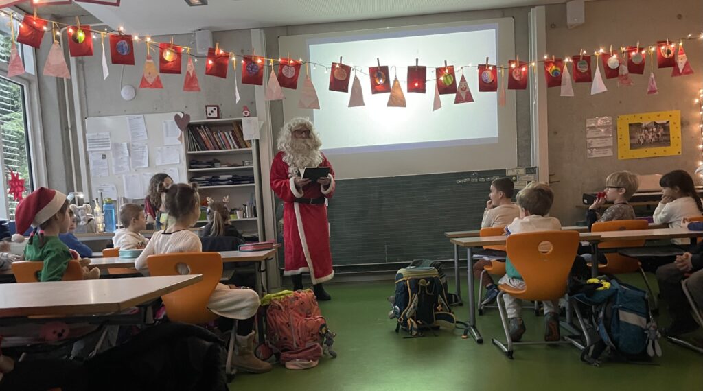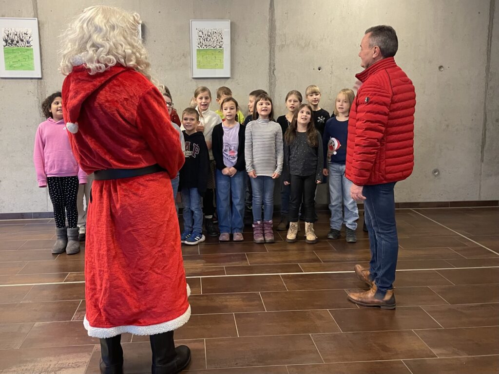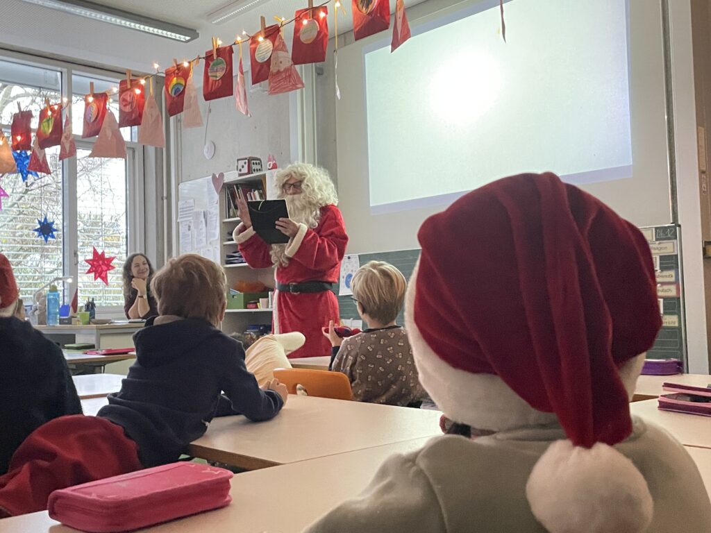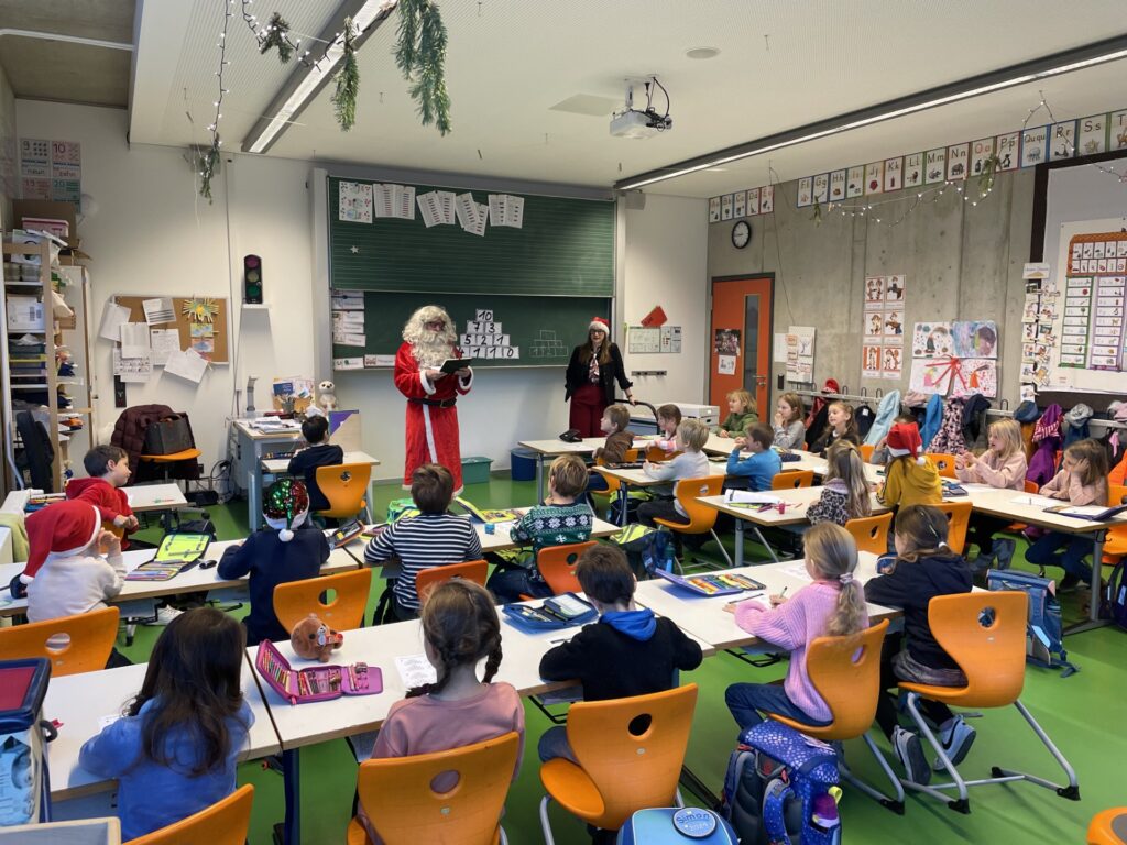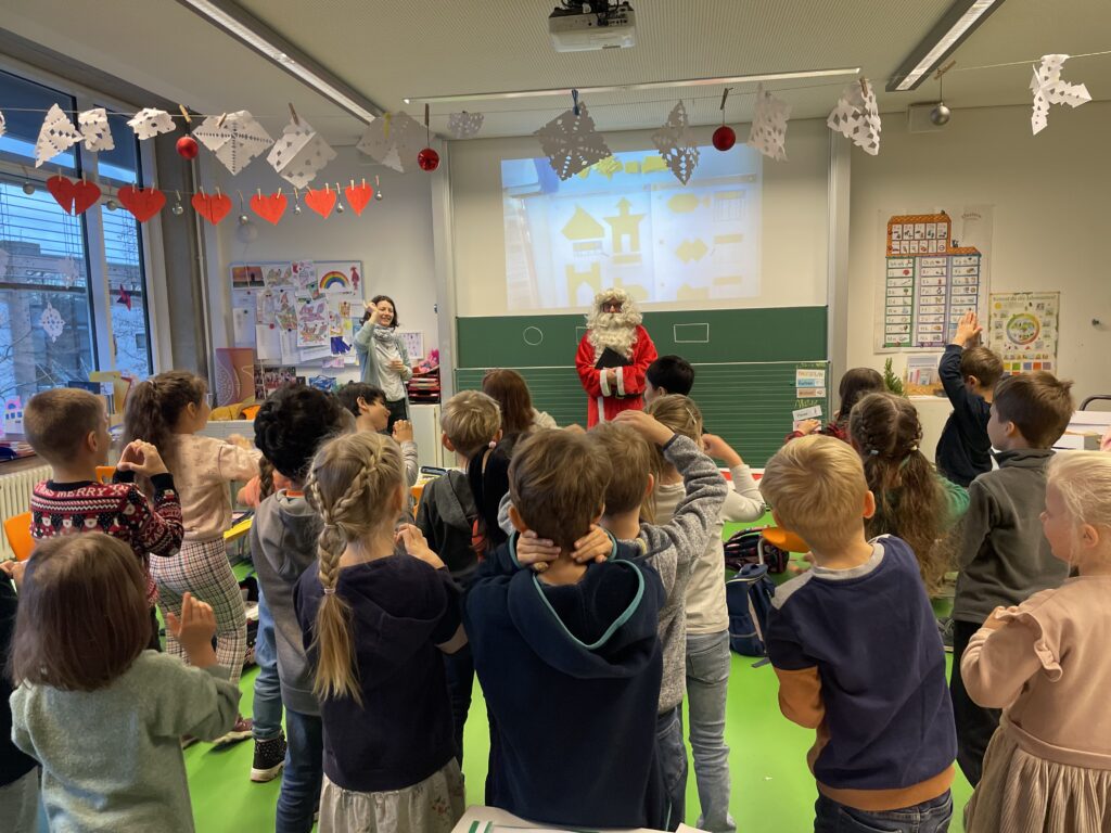 Musikalisch begrüßt wurde er von der 3b mit ihrem Klassenlehrer Herrn Herkert, bevor er die aufgeregten Erstklässler und Erstklässlerinnen in ihren Klassenzimmern besuchte. Auch dort wurde er herzlich empfangen mit Nikolaus- Raps, Liedern und Gedichten.