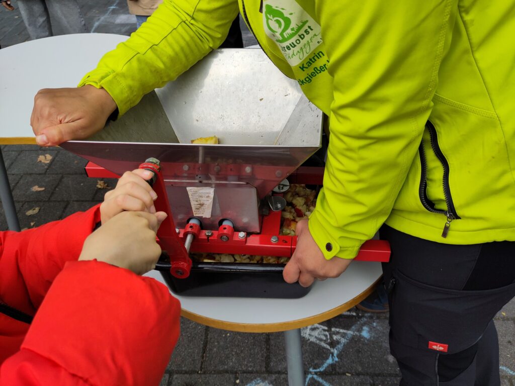 Am Freitag, den 17.10. besuchte Umweltpädagogin Frau Dickgießer-Weiß unsere zweiten Klassen. Gemeinsam wurden die mitgebrachten Äpfel gewaschen, geschnitten, zu Maische verarbeitet und schließlich zu Apfelsaft gepresst. Die Kinder hatten Spaß daran, die verschiedenen Maschinen auszuprobieren und den leckeren Saft zu probieren.