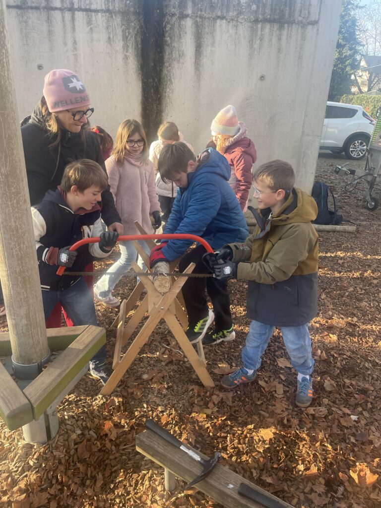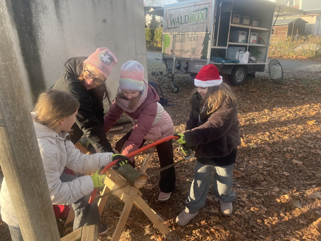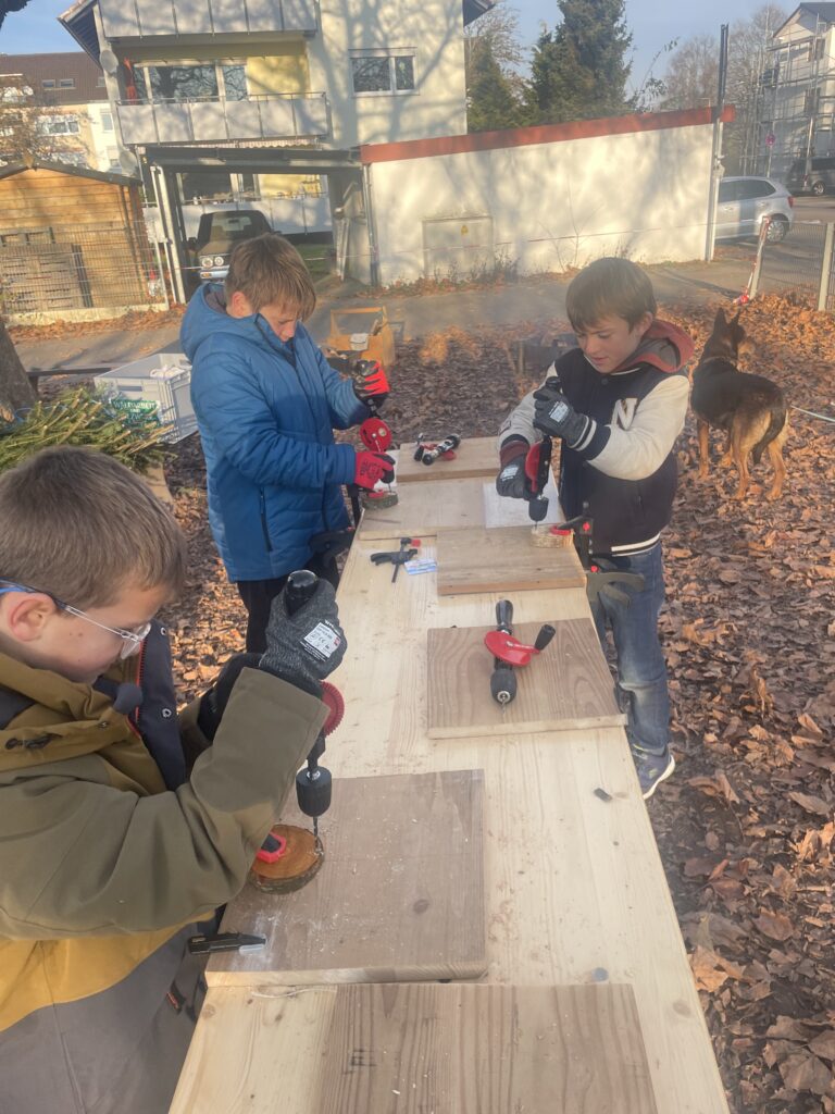 Unter fachkundiger Anleitung wurde auf dem Schulhof gesägt, gebohrt und gestaltet. Dabei sind individuelle und ganz einzigartige Werkstücke und liebevoll gefertigter Weihnachtsschmuck entstanden. Während des Projekttags lernten die Kinder grundlegende handwerkliche Techniken kennen, entwickelten eigene Ideen und setzten diese mit sichtbarem Stolz um.